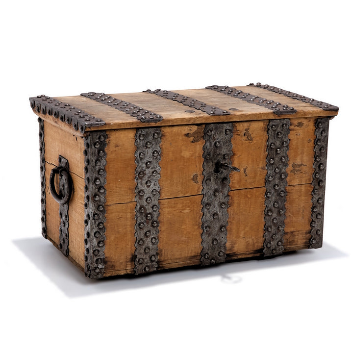 Furu. Rikt jernbeslått. Rektangulær form med bakhengslet lokk. Fungerende lås og nøkkel.